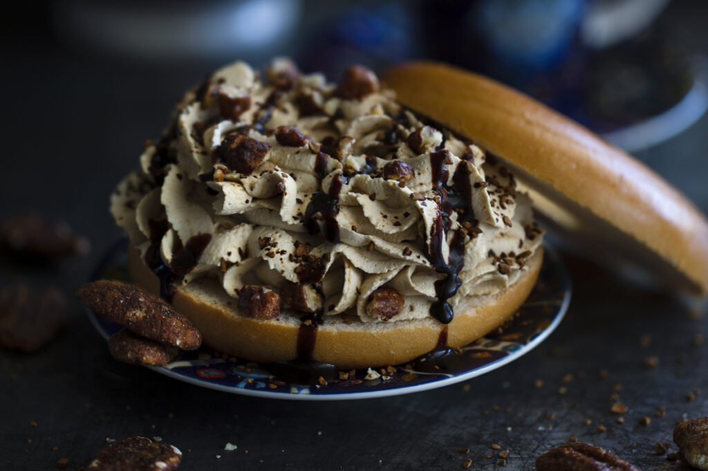 Wow… Now who is this dark seducer? It’s all in now! IngredientsKeski Classic KringlesWhipping creamIcing sugarInstant coffee powderSugar-coated pecansChocolate sauce