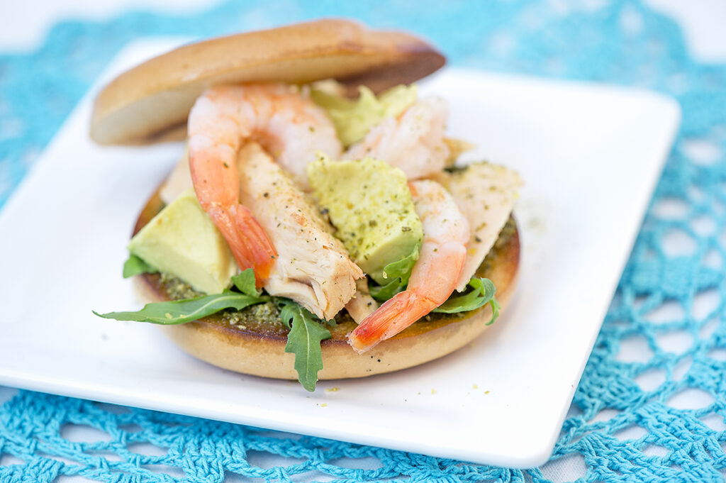 Hienostuneet jättikatkarapuja sisältävät rinkelit sopivat illanistujaisiin tai muuhun tärkeään hetkeen. Nauti hyvässä seurassa! Ainekset 2 annosta 2 Keski Vesirinkeliä nokare voita 4 tl sitruunapestoa iso kourallinen rucolaa 220/150 g valkoista tonnikalafileetä öljyssä, valutettuna 12 jättikatkaravunpyrstöä suolaliemessä, valutettuna 1/2 avokado paloiteltuna muutama tippa lime puristettua mehua limepippuria myllystä