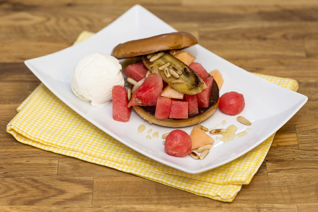 Aurinko paistaa! Kevät on täällä. Nyt on hyvä syy herkutella ja nauttia lisääntyneestä valon määrästä. Hedelmät piristävät. Kokeile! Ainekset 1 annos 1 Keski Vaniljarinkeli 1–2 rkl voita paistamiseen ¼ banaania viipale vesimelonia viipale cantaloupe-melonia 1 rkl vaaleaa siirappia tai agavesiirappia 1–2 tl paahdettuja pinjansiemeniä 1 pallo vaniljajäätelöä