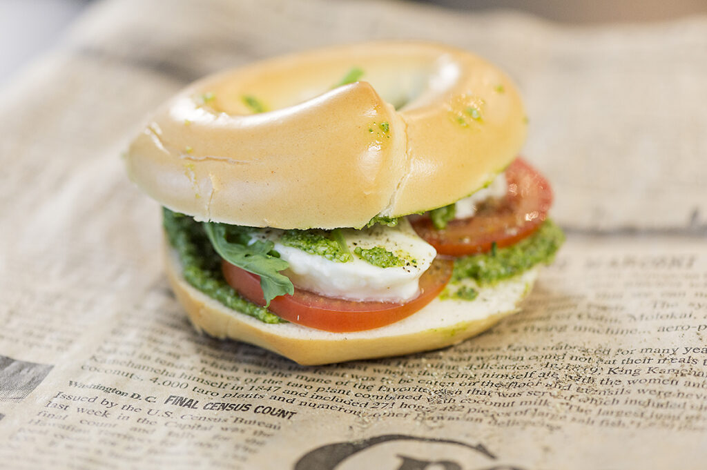 Pyöräytä maistuva pestokastike ja valmista ihana eväs- tai välipalarinkeli. Ainekset 2 annosta 2 Keski Vesirinkeliä 40 g parmesaanijuustoa 1 ruukku basilikaa 1 valkosipulinkynsi 2–3 rkl auringonkukansiemeniä 1–11/2 dl oliiviöljyä ripaus suolaa Lisäksi: 1 iso tomaatti viipaleina 1 mozzarellapallo viipaleina mustapippuria myllystä rucolaa