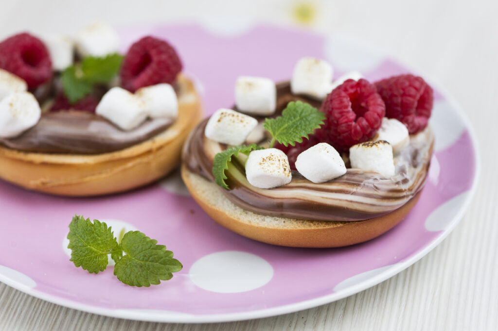 Ihana herkkusuiden jälkiruoka valmistuu kätevästi grillissä! Ainekset 4 annosta 2 Keski Kahvirinkeliä 2 dl pähkinäsuklaalevitettä 1–2 dl minivaahtokarkkeja 1–2 dl tuoreita vadelmia sitruunamelissan lehtiä