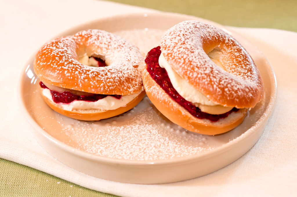 De läckra fastslagskringlorna fyller du som det ska vara med mandelmassa, fräsch sylt och vispgrädde. Ingredienser4 portioner4 klassiska Keski fikakringlor1 dl mjölk1/2 tsk vaniljsockeren halv kaka mandelmassa 100 g hallonsylt1 dl vispgrädde1 msk socker1 tsk vaniljsocker florsocker