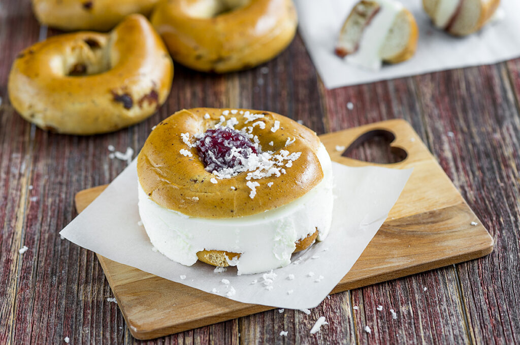 Du kan göra fantastiska bakelser av kringlor, för många olika tillfällen. Servera på alla hjärtans dag,fastlagstisdageller vilken fest som helst. Ingredienser6 portioner6 Keski fikakringlor5 gelatinbladkallt vatten2 ½ dl vispgrädde250 g kesella¾ dl socker2 tsk vaniljsocker2 msk vatten4 msk hallonmarmelad50 g mandelmassa