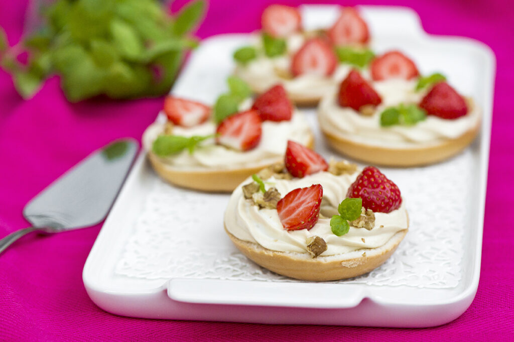 Sitt i trädgården och njut av denna läckerhet med jordgubbar, hackade valnötter och mynta – ochsjälvklart kringlor! Ingredienser4 portioner2 Keski Fikakringlor Original6 msk mjölk + ½ tsk vaniljsocker1 dl vispgrädde100 g kesella½ tsk vaniljsocker2–3 msk socker½ tsk snabbkaffepulver + 1 tsk vatten6 jordgubbarnågra valnötter, krossadenågra myntablad