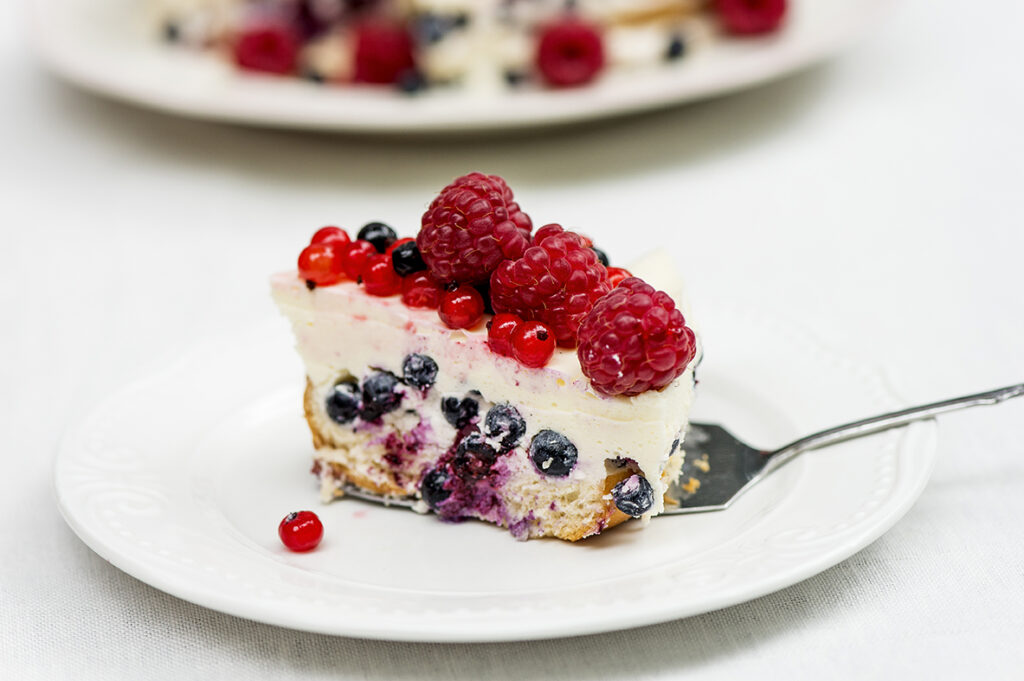 Våra underbara kardemummasmakande Fikakringlor Kardemumma blir till en fantastiskkardemummakaka. Dekorera med fräscha bär efter säsong. Ingredienserca 8 portioner2 Keski Fikakringlor Kardemummaca 1 dl mjölk1 tsk vaniljsocker5 dl blåbärFyllning:5 gelatinblad2 ½ dl vispgrädde200 g kesella citron2 tsk vaniljsocker¾ dl socker½ dl vatten eller citronsaft Topping:ca 5–7 dl bär (t.ex. röda vinbär, blåbär och hallon)